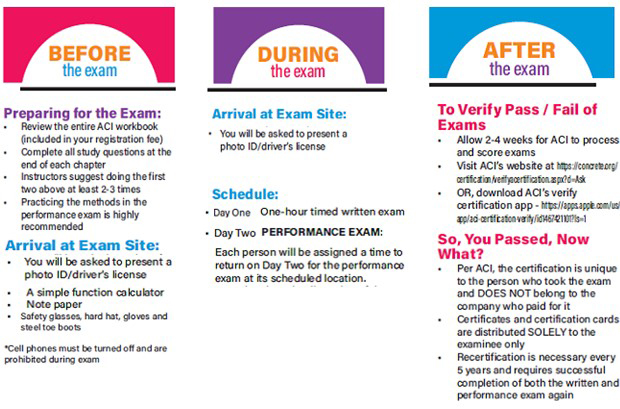 This program has been developed for certifying individuals who will then be competent to conduct field tests on fresh concrete. The program covers details of ASTM procedures and consists of a written and performance examination. The performance examination requires the candidate to demonstrate his/her ability to correctly perform and record the results of field tests on fresh concrete.